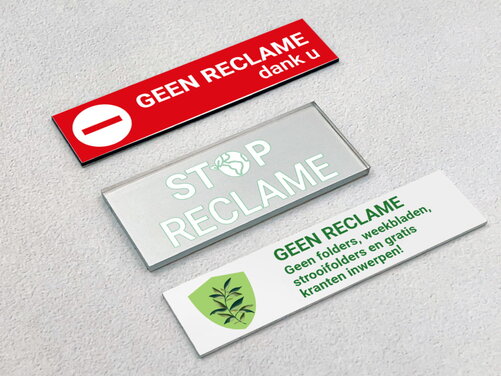 Je kunt kiezen uit verschillende letterstijlen die passen bij de uitstraling van je woning. Van moderne, strakke fonts tot klassieke, elegante lettertypen - alles is mogelijk. Ook kun je de tekst volledig aanpassen: naast "Geen reclame" kun je bijvoorbeeld je naam toevoegen of een vriendelijke boodschap zoals "Alleen geadresseerde post, bedankt".