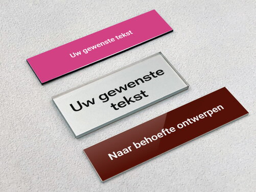 Voor professionele uitstraling adviseren we minimaal 10x3cm voor deurnaamborden en 15x5cm voor bewegwijzering. Grotere formaten bieden meer ruimte voor uitgebreide tekst en logo-integratie. De plaatdikte kan worden aangepast aan de toepassing - 1,6mm voor binnengebruik, 2-3mm voor buitentoepassingen.